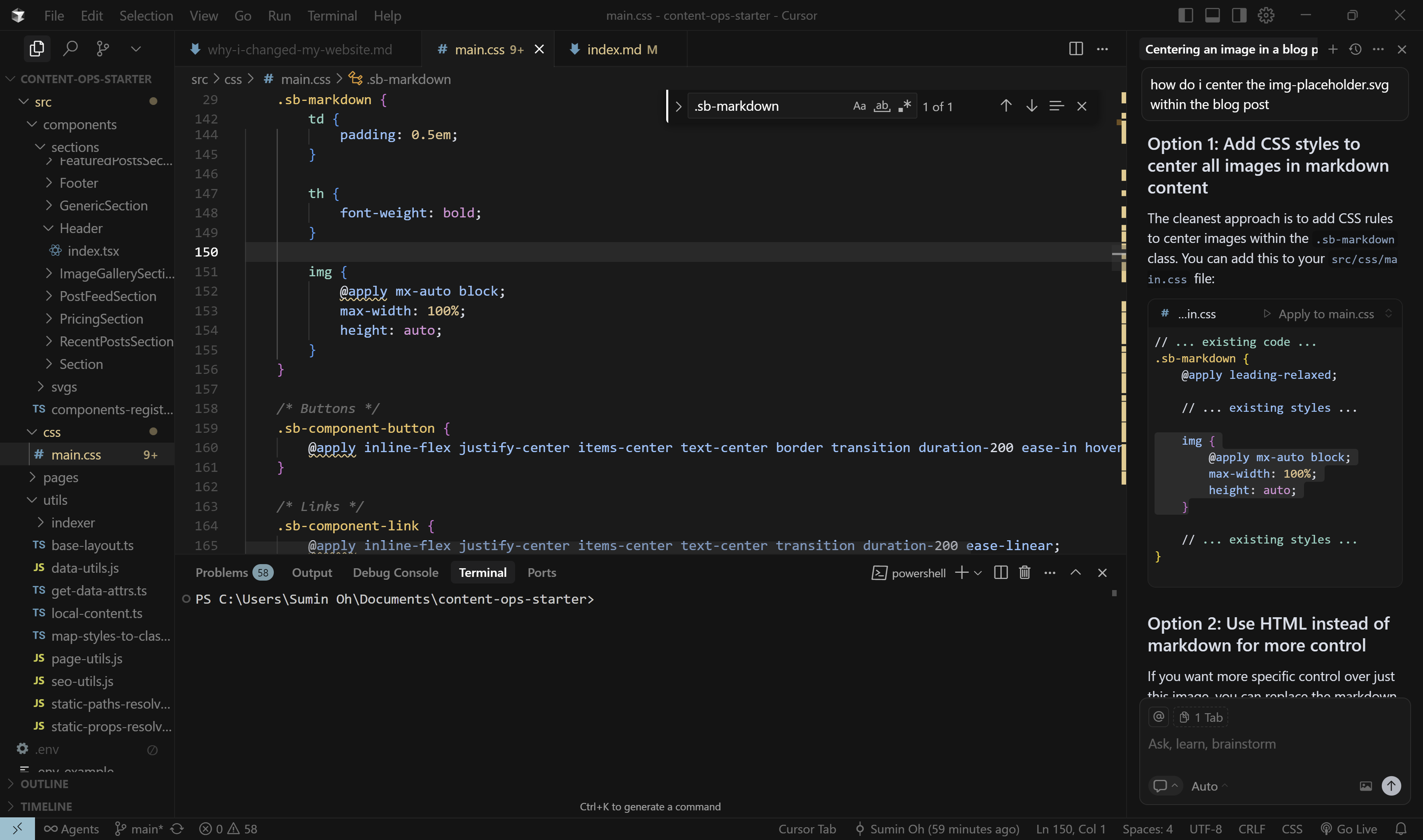 I found a free template and started modifying that instead! The initial updates didn't require much AI assistance because it was pretty straightforward to review the files and get the gist. For things I wasn't sure about, I turned to Cursor. Instead of relying on the agentic mode to do everything for me, I'd ask questions on how to modify something or to debug. I didn't like how it was modifying files that weren't relevant to the changes I requested, so I opted for some manual copy-and-pasting. This way, I can start learning how the files are organized and structured.